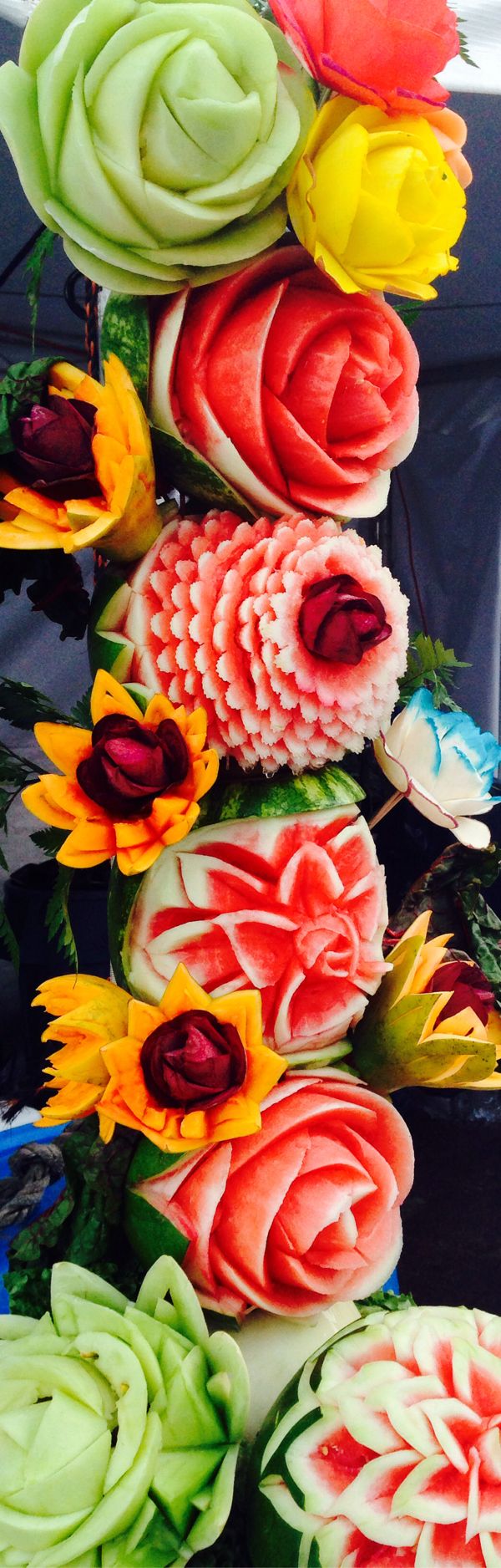 手先が器用な人が野菜や果物を切ると、アート作品になりますね^_^ 料理学校の人達が街頭で宣伝をしていました。 ただパンフレットを配布するより目をひくと思います。 サンフランシスコにも同じ学校があります。 以前はシェフの服装でタバコを吸っている人達を沢山見かけましたが、今もそうなんでしょうか?