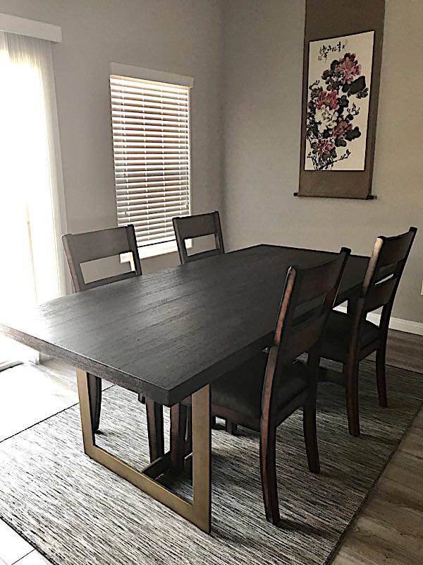 今朝、ダイニングテーブルが届きました! 旦那は家が狭くなったと言い、相変わらずTV前にちゃぶ台とキャンプ用椅子を置いて使ってます。