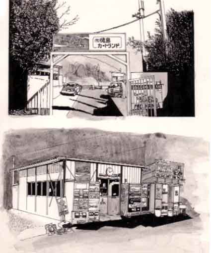 イラストは「徳島カートランド」の入口と、プレハブの管理棟です。