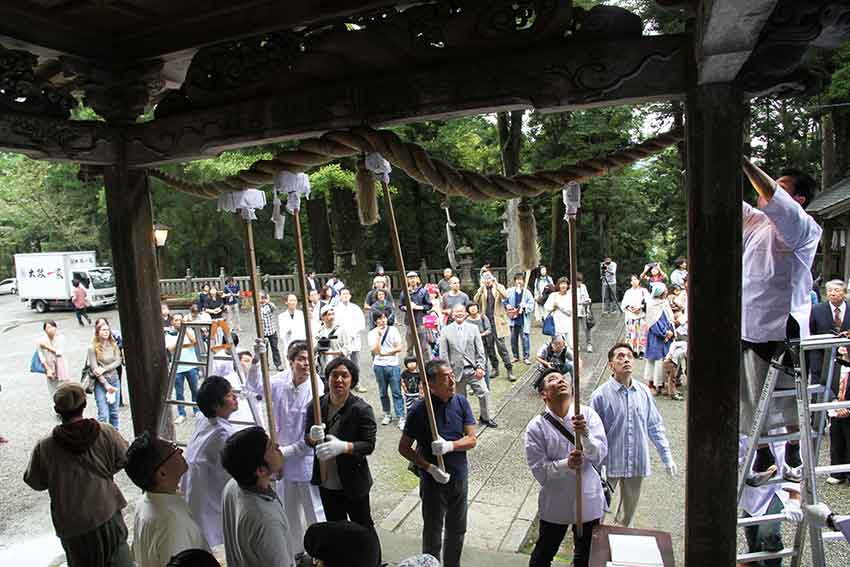 古い注連縄をボランティアの皆さんが協力して取り外します!!