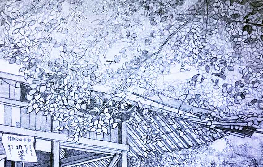 お堂の前に木の葉があり・・・さて、どう表現するか・・・