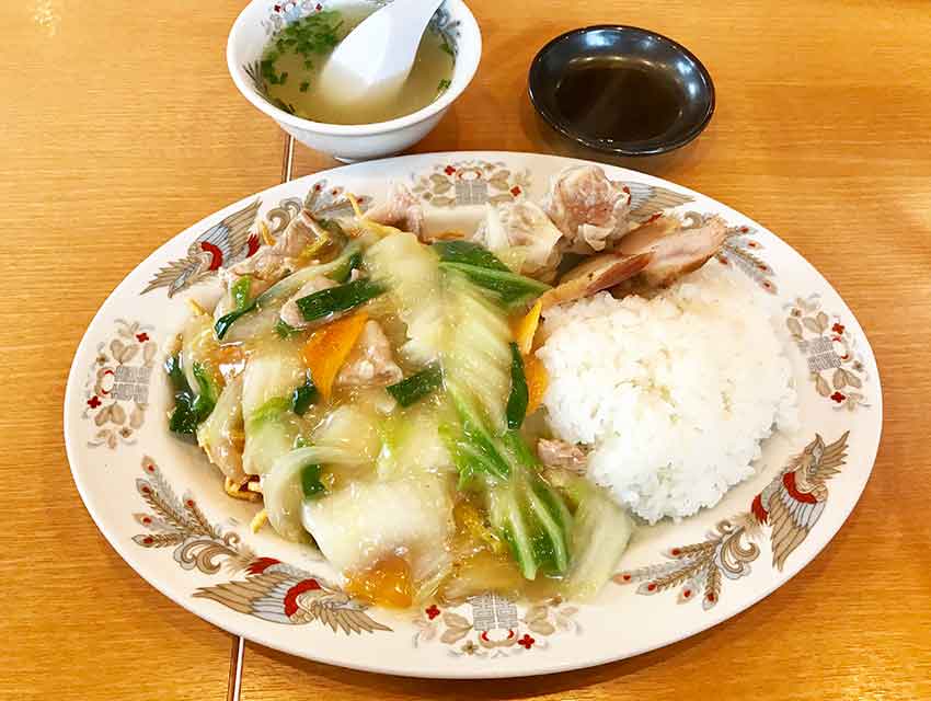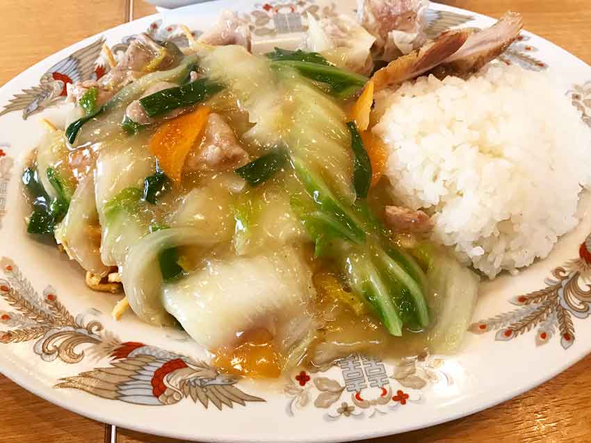 ご飯の上に、揚げ麺、野菜たっぷりのあんがのります♪
