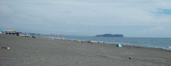 下は鵠沼、江の島方面、人はぽつぽつで閑散、砂浜は熱地獄