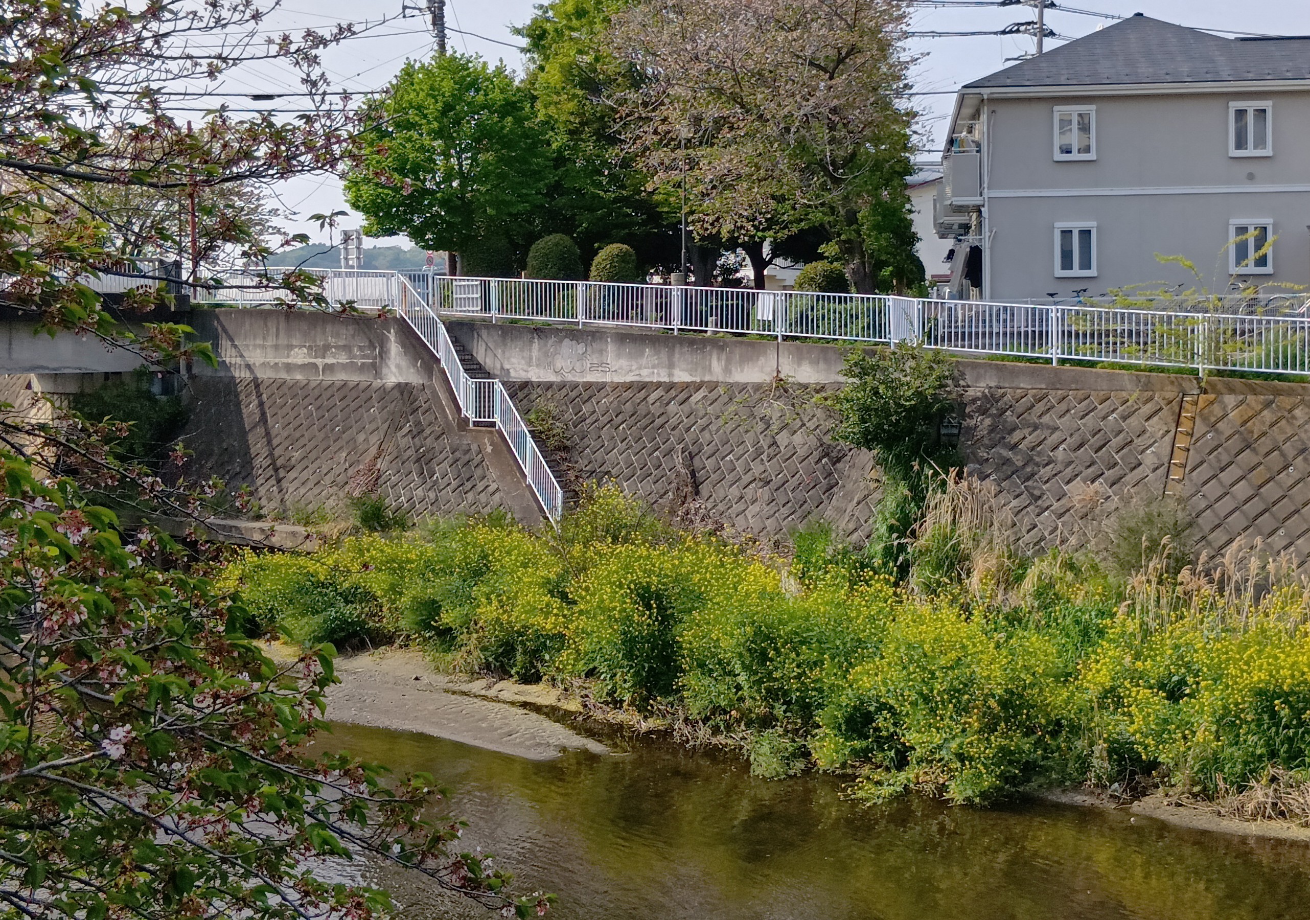 大規模な河の浚渫工事で川洲がなくなってしまったが、ところどころ残った場所に明るい菜花が色を添えていました。