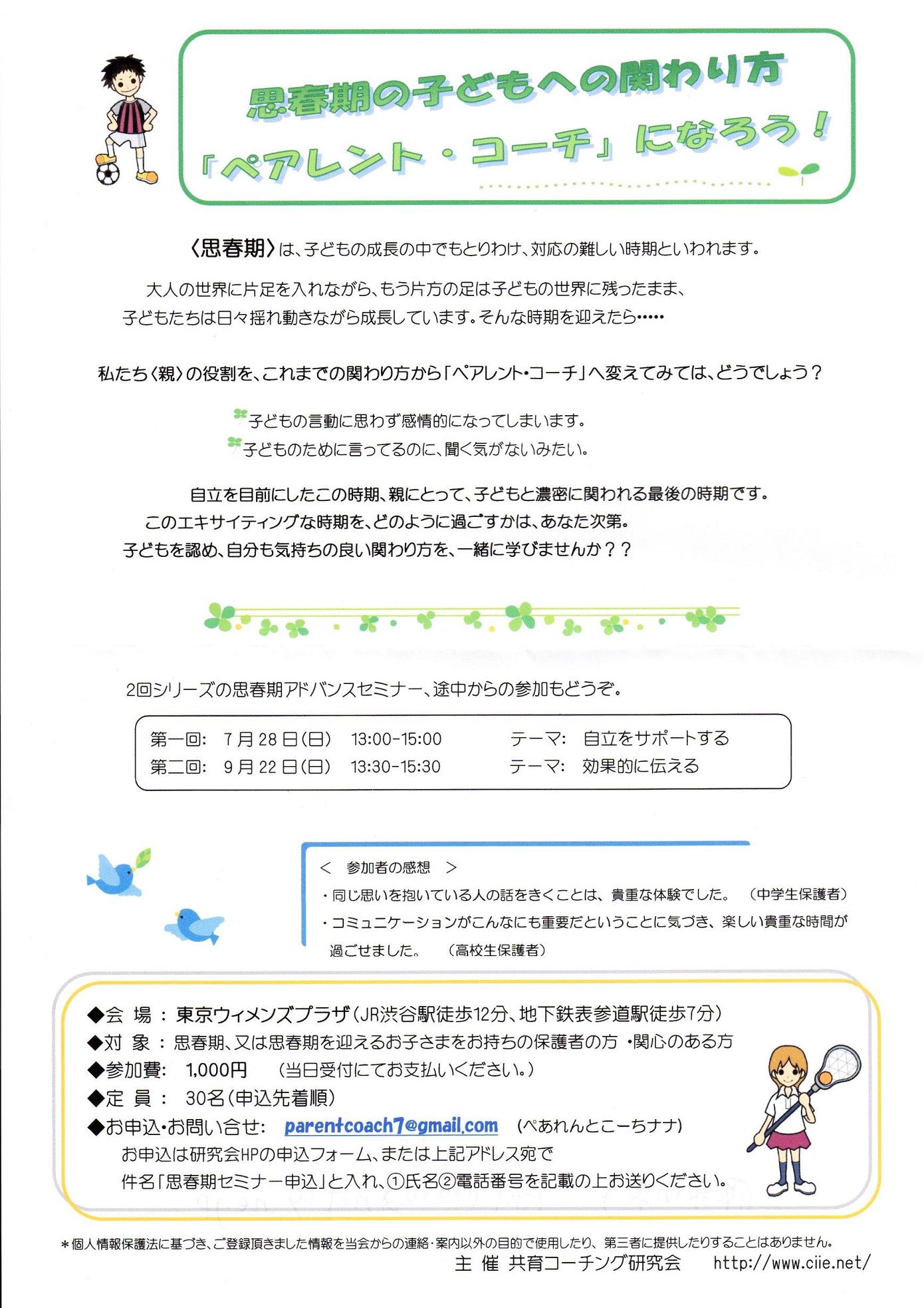 ペアレント・コーチ先日、コーチングを習っているところで、上記のコーチングセミナーがあることを知りました。知らせて頂いた友人は、笑顔の素敵な明るい女性で、多分、ほとんどヴォランティアでこの活動をしていると思います。パンフレットに書いてある様に、子供の言動に思わず感情的になってしまったり、子供のために言っているのに、聞く気がないみたい、という、多分ほとんどの親御さんが抱えている問題についてのコーチングセミナーの様です。私はその会にまだ出ていませんが、多分その友人の質から、温かく笑顔のうちに進んで行く様なものだと思います。受験生の親御さんは、ある意味でとても孤独だと思います。特に親御さんがお子さんを思って言っているのに、反対にとられたりと、辛い思いをされている方もいらっしゃると思います。「思春期」と書いてありますが、目的は上記の様なセミナーなので、中学受験生の親御さんも大丈夫だと思います。詳しくは、パンフレット記載アドレス、または以下にお問い合わせ下さい。http://www.ciie.net/2012/07/27/%E6%80%9D%E6%98%A5%E6%9C%9F%E3%81%AE%E5%AD%90%E3%81%A9%E3%82%82%E3%81%B8%E3%81%AE%E9%96%A2%E3%82%8F%E3%82%8A%E6%96%B9-%E3%83%9A%E3%82%A2%E3%83%AC%E3%83%B3%E3%83%88-%E3%82%B3%E3%83%BC%E3%83%81-%E3%81%AB%E3%81%AA%E3%82%8D%E3%81%86/その友人からのメールで、はっと思い当たることがありました。私にも、とっても必要な内容だと思いました。今回は都合がつきませんが、またあれば出てみたいと思っています。この記事がご参考になりましたら、以下をクリック頂ければ幸いです。 中学校受験 ブログランキングへ