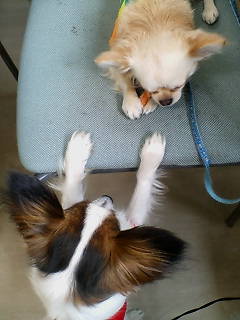 ガツガツ自分のおやつを食べてしまったたランはのんびりおっとり、いつまでも食べてるスケぞうを鷹のような目で見つめています。チワワらしからぬドスの効いたうなり声がスケぞうの喉奥から発せられます。いったんは怯むラン。しかし!ポンポンと気安くスケぞうの肩を叩いては「おやつを分けてくれないかなぁ…」と打診します。再度ドスの効いたうなり声。スケぞうはいつもランにおやつを食べられてしまうので、今日は一歩も引きません。ところが!!「おりゃ」とばかりランの左ストレートが炸裂します。…結局いつものように取られてしまいました。アイリスがいてくれたら、守ってくれたのにねぇ…。