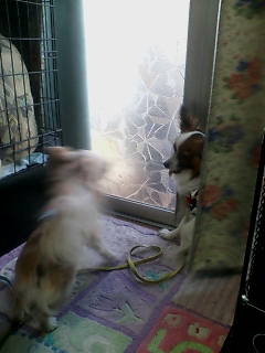 ランもスケぞうも弟が苦手です。別にいじめたりしないし、むしろかわいがってるのですが、彼らの目には、そうは映っていないようで…天敵です。弟が側にいるので、しぶしぶ自宅待機のラン。生気のないうつろなまなざしが弟への恐怖心を物語っています。「あーあーあー。早くどっか行っちゃえよー」ってな感じでしょうか。それが、弟がドアへ向かうと「おお」期待に満ちたまなざしに変わります。でも、弟が面白がって引き返してくるとやっぱり元のうつろなまなざしに…。犬って表情豊かで面白いです。