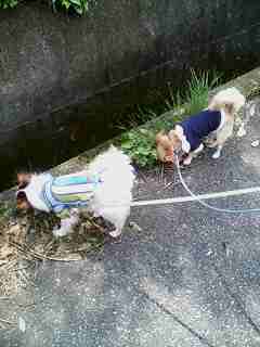 スケぞうとラン。2匹仲良くお散歩です。でも、ランには妙な癖があって…。帰り道になると、自分のリードをくわえて、引っ張るんです。「早く早く!」ってせかすように。写真を撮ってばかりで、なかなか前に進まなかったら、さらにグイグイ引っ張られるようになりました。「来て来て来て来て」って小さい子がだだをこねているよう。スケぞうは歩くのに一生懸命で、そんな主張はしないんですけどね。昨日狂犬病の予防接種を受けてきたから、今日はバテバテの2匹です。