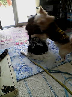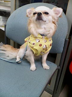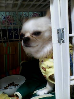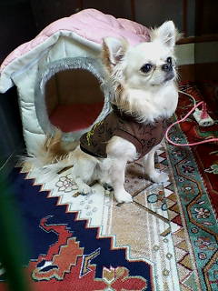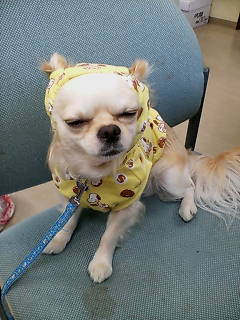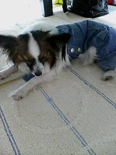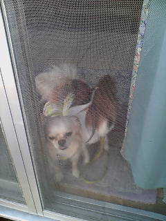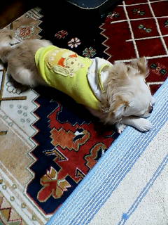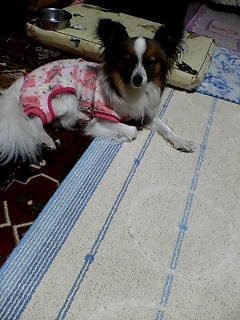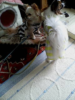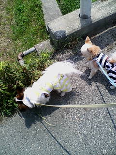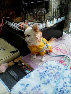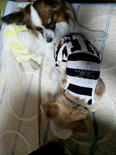 新しい服を着たランと張り合って、最初に来ていた服を着替えさせてくれるよう母に訴えたスケぞうくんです。この服は気に入ってるご様子。明日は雨みたいです。連日の蒸し暑さはこのせいだったのかな…?犬たちもぐったりです。
