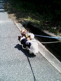 お散歩風景です。こんな風に仲良く歩いてることは珍しくてたいていまっすぐに歩かず転げ回って遊んでいます。行きはわりとゆっくり歩いているのですが、帰りは必ず全力疾走です…。…疲れます。なぜなんでしょうね。