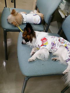 今日は色違いのお揃い服を着ています。この服、すごくかわいいつなぎタイプの服だと、衣装の足の部分が抜けちゃうことが多いのですけど、この服はパンツ部分の丈が長いせいか抜けません。かわいいだけじゃなくて、機能的犬たちも、新しい服を着せてもらえてご満悦。