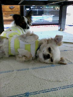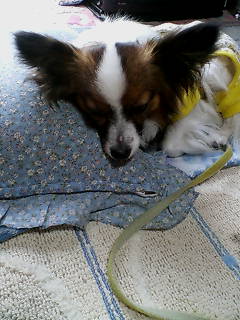 お散歩のあとの休憩です。行きはのんびり、帰りは全力疾走の不思議なお散歩なのでお疲れのご様子。だんだん暑くなって来たので、アスファルトが熱せられ、お散歩もツライ季節になって来ました。
