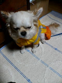 スケぞうの新しい服です。犬用の洋服のフードには、耳が出せるようになっているモノが多いです。ですが、洋服を着るのが大好きで自分の特権だと思っているフシのあるスケぞうでもフードをかぶるのは、あんまり好きではないみたい。すぐにぶるぶるぶるっと頭を振って、脱いでしまいました。よそのおうちの犬は、フード好きだったりするのでしょうか?