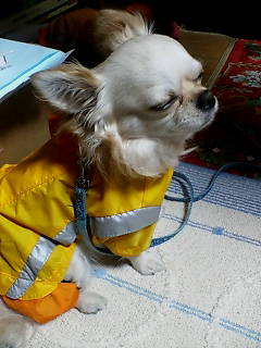 昨日スケぞうとランに新しい洋服が届きました。ランはレインコート以外の服を持っていないので、(これまでのは全部スケぞうの服を借りてます)初めての専用の服となります。「これがランの服だよ~」と言うと、嬉しそうに表情を輝かせていたのですが、朝、雨が降っていたので、スケぞうもランもレインコートを着用することになりました。でも、雨はお昼前にあがってしまいランはガッカリ。