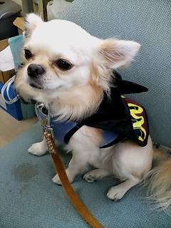 バットマンの衣装に身を包むスケぞう。着ぐるみ系は私の趣味ですが、おっとりした表情を浮かべています。母がフードになったマスクをかぶせたら背後からランが襲いかかって来ました。