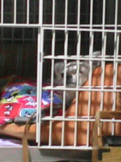 みんなが夕ご飯を食べてるときスケぞうはいつもこうやって待ってます。格子のトコに鼻を引っかけて、退屈そうに眺めてます。待ちくたびれちゃったみたいですね。