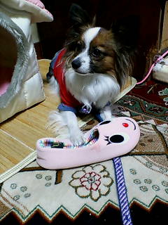 ランの、今一番のお気に入りは母のスリッパです。顔が描いてあるトコが気に入ってるのかよく連れて歩いてます。ランは、もともとぬいぐるみやおもちゃが大好きでランのもスケぞうのも全部自分の周りに並べています。