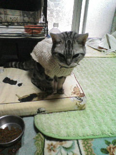 母が数年前に編んだセーターを着たアイリスです。写ってませんがアラン模様の、なかなか凝ったセーターなんです。アイリスも気に入ってるらしく脱がせようとすると怒ります。やっぱり暖かいのかな。