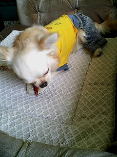 体調でも崩したのか、昨日からややご機嫌ナナメのスケぞうでしたが、おやつをもらうと大事そうにくわえてお気に入りの場所まで持っていきました。うっとりとお食事中。