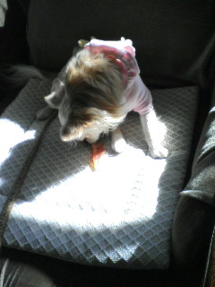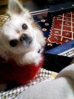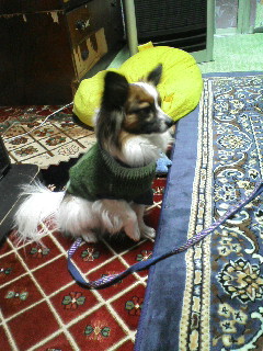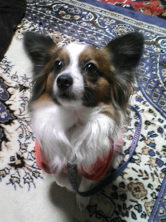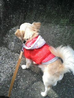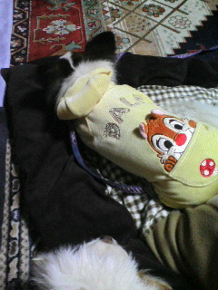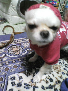 母に着替えさせてもらってる途中のスケぞう。着替えさせる方も着替える方も、手慣れたモノです。最近、近所では洋服着用でお散歩してる犬が増えました。大きい犬も小さい犬も、何かしら着てます。