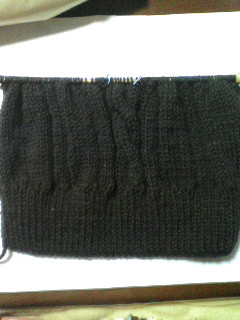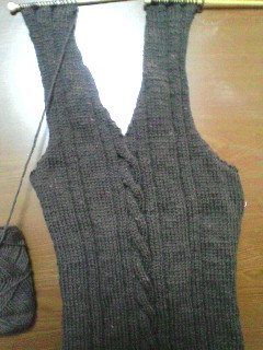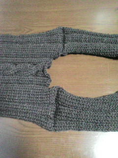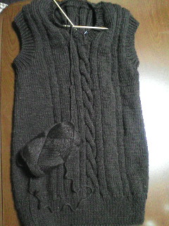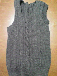 彼の誕生日プレゼントにしようと製作中のベスト、ようやく肩をつなぐトコまで来ました両脇もつないでこれは前から見たところ。こっちは後ろから見たところ。ホントはチョコレートブラウンなのですが、グレーぽく写ってますね。あとは襟と両袖のゴム編みを残すのみ。ちょこっとずつ形になって行くのが嬉しい。初心者でも、続けていればできるんだなぁ…って。