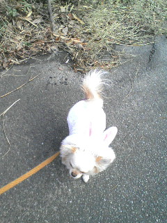 寒さにも負けず、お散歩です。スケぞうはウサギスーツ。頭が重そうですが、服自体はビックリするほど暖かなのでよく着てます。