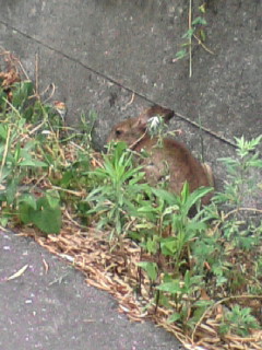 お昼休み、彼と電話しながらお散歩をしていたらウサギに遭遇しました。草むらから見えた顔は結構大きかったので(たぶんチワワなスケぞうよりは大きい)最初シカかと思い、「野生のシカを見るのは初めて」と喜んでいたら、びよーんびよーんびよーんと飛びはねて行きました。足が長くて背丈も高く、(この画像ではわかりませんが)痩せていました。「目を合わせなければ大丈夫」とでも言いたげな横顔(笑)そう言えば、野ウサギ目撃談はいろんな方から聞いてたんですよね。いわゆる『かわいい』って感じではなかったです。まさに『未知の生物』って感じでした。