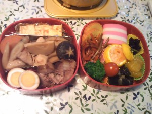結局2012年になってから、お煮しめの準備を始めた。年始のたのしみはカウントダウンTVなんと言ってもスマップのLIVEがある。そして今年は、AKBも・・・うれしい限りだ☆おこたの上に、切り揃える材料をならべ、蓮の皮をむき、里芋の皮をむき、こんにゃくをねじり、手綱こんにゃくに、ごぼうを切って、しいたけに模様をいれて・・・スマップの歌を聞きながら超ゴキゲン!去年は年女だったのに、ことごとくコンサート関係は外れた!!来年こそまた行きたいな~ この5人は、ほんとうに沢山の人を幸せにするパワーをもっている。中居くんも震災以降なんか、より使命感が変わった気がする。ツヨポンはいつものとおり、眠そうなかんじだったけど、やはりこの人のターンとバック転は、大好きだ!! なますのにんじんと大根をトントンきざみ酢につけて、今年はゆずの中身をぬいて、うつわにして入れてみた。この写真は、病院に入院している義母様用☆もう23年も昔になるが、結婚したての時、実家の父が事故でけがをしてお正月入院した。そのとき、義母は、おせち料理をお弁当箱いれて作ってくれた。ずっとそんなむかしの事わすれてしまっていたけど、なます切っていたら急に思い出して、あの時のきんぴらごぼうがやたら美味しくて、結局3時すぎにきんぴらごぼうを作った。 心のこもった、美味しいお料理の味は、何かの瞬間に思い出すものですね~あの時のお礼には、まったく及びませんが、一日も早く元気になるように、心を込めてつくってみました。 一段目は、紅白かまぼこ、伊達巻、昆布巻き、黒豆、なます、栗きんとん、きんぴらごぼう☆2段目は、おばが築地から仕入れた丸武の厚焼き玉子(テリー伊藤さんのしんせきのお店)、煮しめ、そしてシェフ(夫の)のつくった豚の角煮☆ゆでたまごも投入しておきました。お肉も柔らかく、とっても美味しかったですよ!まあこんなふうに2012年も始まりました。今度は年賀状☆届いた年賀状に返信しなきゃと思うのですが、結局PCを使いこなせず、図柄ができたのにプリントできません。初日の出から帰った息子が起きないと年賀状もかけないなんて・・・あ~あ☆ 娘のお友達が巫女さんしているというので、会いに行ってこようかな☆たかとり天満宮という、学業の神様なので、受験生の3番目を連れて行ってこよう~