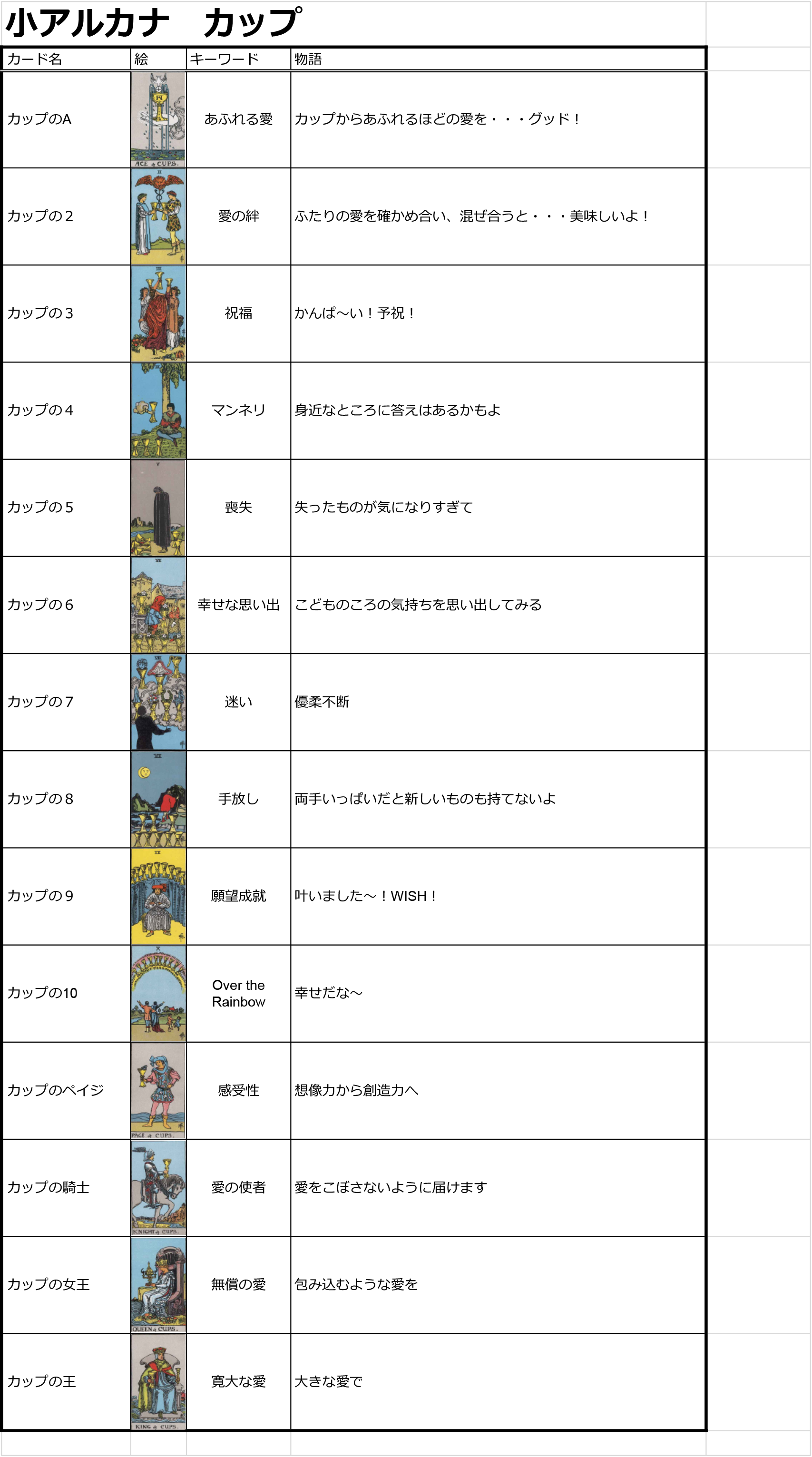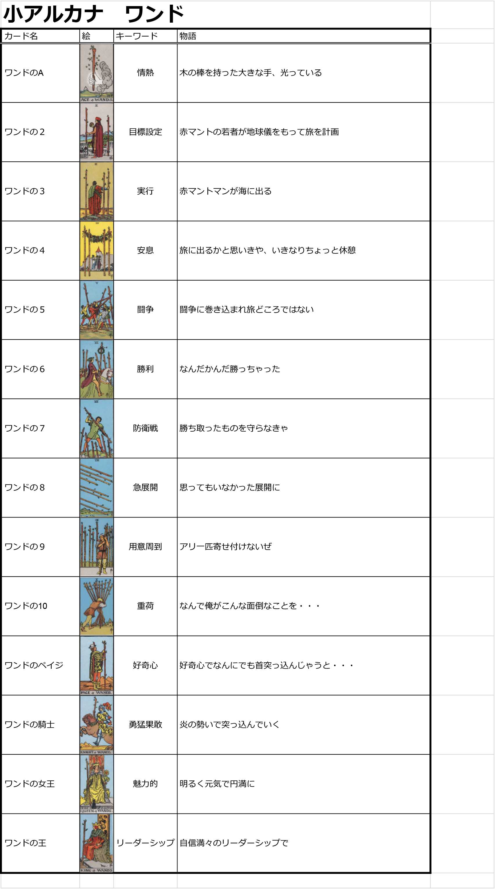 タロットカードを最低限の意味だけでも覚えようとしてはじめて、・キーワード・何が書かれているか・セリフを想像するというルールでとりあえず、タロットカード全78枚追ってみました。けっこう、覚えたかもしれない。キーワードやセリフを考えるうえでいろんな本やネットでカードの意味を調べたので、絵柄とだいたいの意味は頭に入ってきたかもしれません。次はこれを活かして練習ですね。慣れないうちは一覧表など作ってみながらやろうかな・・・ってことで一覧表。まずは大アルカナだけ。小アルカナも随時アップします。【90ページ日本語解説書付き 】タロットカード 日本語版 初心者用 アプレンティスタロット 見習いタロット 日本語解説書付き ウェイト版 正規品価格:4,180円(税込、送料無料) (2024/5/13時点)楽天で購入