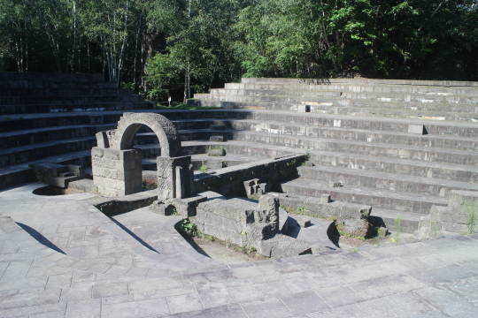 ネガティブとポジティブを表現した高低差のある、コロシアムのような不思議な空間。自然の軟石で作られたステップが水紋のように拡がります。