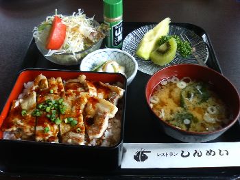 昨日のお昼はまたしても「レストランしんめい」でランチだった。というのもサービスフェアの折込チラシが昨日の朝刊に入っていたからである。例えば、妻の大好きな「しんめいハンバーグ」千円が800円に、この間のランチで食べた「豚焼肉定食」580円が480円である。今週は2回目の来店になって少々恥ずかしいところだが、結局来てしまった。 しかし、また豚焼肉定食というのもちょっと詰らないので、いろいろ考えた挙句、通常価格千円の豚丼が800円でのご提供と言うことで、自分は豚丼を注文することにした。妻は、しんめいハンバーグセットである。ハンバーグは何度か紹介しているので、今回は豚丼について書いてみることにする。 実は、この豚丼。以前に一度だけ注文したことがあったのだが、そのときはもっと醤油ダレで豚肉が真っ黒な状態で、食べてみても塩っぱかった。写真をご覧になってもらうとわかるように、どうもそのときと作り方が違っているようだ。肉はトンカツにするような豚ロース肉2枚分がソテーされていて、それにほどよく醤油ダレがかけられてる。以前のような塩っぱさはなく、肉も柔らかくて明らかに以前食べたのより美味しくなっている。上に浅葱がかけられていて、好みで山椒をかけて頂く。意外だが、山椒もなかなか合っている。味噌汁がついて、サラダ、御新香、デザートのフルーツがついて800円は間違いなく安い。通常価格千円でもリーズナブルではある。詰まらない事だが、御重に入っているので「豚丼」ではなく「豚重」だと思うのだが。
