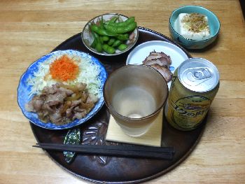 昨日はブログをサボってしまったが、8月15日についてはもう少し書きたいことが有った。妻が実家に帰っているので、自分も自分の実家でタダ酒を頂こうと、同じく実家に帰っているはずの弟の携帯に電話を入れてみた。私「久し振り。今どこ?」弟「今、実家。何?」私「そろそろ宴が始まってんじゃないかと思って…。」弟「全然!兄貴いないモン。」私「?どこへいったの?」弟「宝木(兄嫁の実家)!遅くなるってサ。」私「あっそう」 がっかりして電話を切ってしまった。仕方がないのでこれから自分で夕飯の支度である。冷蔵庫を見てみたら、昨日自分が買ってきた豚の三枚肉があったので、これで生姜焼きでも作ってみるかと。ランチに「昭和元気ホルモン村上」の豚ホルモンランチを食べたのにもかかわらず、夕飯も豚肉とあいなったわけである。駄目押し的に妻の実家から帰りしなに頂いた焼豚も付けてみた。冷奴と枝豆は前日と同じである。 出来上がった料理が下の写真の通りである。まあ妻が居なければ実現しないような夕飯ではある。間違いなくキャベツの千切りは自分のほうが上手い筈。付け合せの人参の千切りも妻がやらないテク。手前味噌だがけっこう旨かった。 明日は何を作ってやろうかと思って考えついたのが、妻の嫌いなジャガイモと残り物の豚三枚肉を使ったポークカレー。こちらもちゃんと自分で作って美味しかったのだが、写真に残すのを忘れてしまった。残念! まあ少々寂しいながらも美味しいにわか独身の三日間であった。