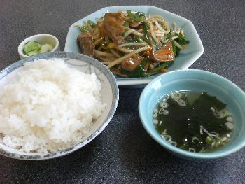 今日の午前中は、なんだか眠いようなだるいようなで仕事に身が入らない。生暖かくて湿気の多い今日の天気がそうさせるのか、此処の所の天候不順で体が参っているからなのか分からないが、多分そんなところだろう。そんな訳で、せめて栄養だけはつけて体力回復を図ろうと、ランチは例のメニューの多い店「集いドライブイン」で、レバニラ炒定食を頂いた。出てきた料理が下の写真である。 若干あんかけ風に片栗粉が絡まっている感じの醤油風味でもやしがシャキシャキしていてなかなか美味しい。ニラの臭みもそれほど気にならなかった。レバーの味もまあまあである。戻ってひと休みした後、またパソコンに向かって仕事をやり始めたのだが、やっぱりなんだか午前中と違う。レバニラ炒めに元気を貰った感じである。ネットで調べてみると、レバニラ炒めは、亜鉛やビタミンA、Bが多くCも含まれ、造血作用のあるヘム鉄、葉酸が多く、赤血球形成に欠かせないビタミンB12も多いらしい。とにかく栄養満点、夏バテ解消にこれに勝る食物はないと断言できるほどである。一度お試しあれ。