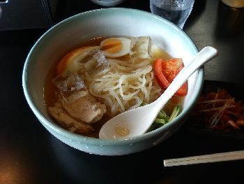 昨日NHK総合のテレビ番組で「いよっ日本一!『暑いから元気 夏の日本一!』」というのをやっていて、山形の「冷しラーメン」や「冷し肉そば」の話が出てきていた。そのせいもあって、今日は近所のラーメン屋「ちゃあしゅう屋」の割引券があったので、冷し中華を食べてきた。 余り期待しないで来てみたのだが、なかなかどうして変り種の冷し中華があったので、自分はそれを注文してみた。その名は「カツカレー冷し」。要するに冷たいカレースープの冷し中華にトンカツが載っているという、ちょっと豪華な冷し中華である。妻はオーソドックスに「昔ながらの冷し中華(胡麻ダレ)」を注文。程なく運ばれてきたのが下の写真の通りである。 この店の冷し中華の麺は、普通の中細麺なのだが、如何なカレースープとはいえ量が多くて食べていると次第に飽きてくる。そこでアクセント的にこのトンカツを一口頬張りながら食べ進めていくという具合である。カレースープには冷し中華独特の甘酸っぱさがなく、ターメリックの味と香りがしてなかなか微妙な辛さと塩加減でなかなか美味しい。一度食べてみる価値はあるかも。 昔ながらの冷し中華の方は、胡麻ダレの香りが良くて美味しかったらしいのだが、やはり小食の妻には多すぎる量だったようで、少し残してしまった。というか妻の本命は食後のデザートの完熟メロンのソフトクリームだったようで、そちらはしっかりと平らげてしまった。