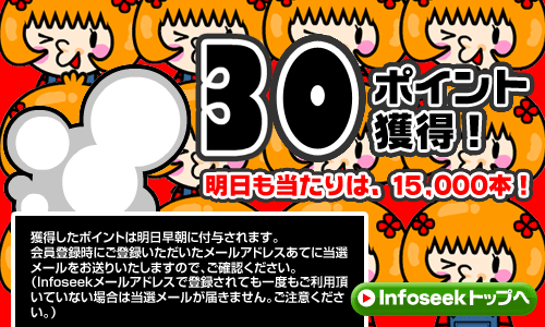 毎朝、朝食を摂る前に、メールチェック、BINGO、インフォシークラッキーくじ、ラッキーサーチ、楽天くじ、楽天ブログくじ、ポイナビという順番で、楽天ポイントをコツコツ貯めたりしているのだが、いつもせいぜい1ポイントがいいところ。ところが今朝はインフォシークラッキーくじで30ポイント当たった。今日は何かいいことあるかなぁと思っていたのだが、何も無しである。最近懸賞に応募するもハズレてばかりだし、まあ人生なんてそんなものである。
