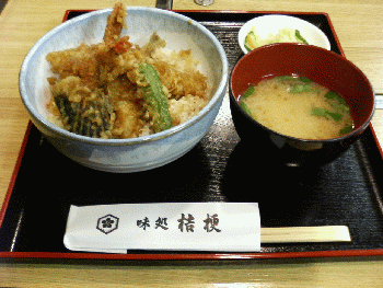 ガスレンジの調子が悪いので、ちょっとホームセンターへガスレンジを見に行ったついでに、先達から「ワンコインランチ」で何度も話題に出した例のホテル「ホテルニューイタヤ」のワンコインランチを食べに行ってみた。とはいえ妻も同行なので、本日、夫婦そろって食べられるワンコインランチは「日本料理 味処桔梗」の天丼である。 お店は南館2階にあり、こじんまりとした割烹料理店といった雰囲気の店構えである。若干照明が落としてあって、落ち着いて食事が出来そうである。 黒い制服のウェイトレスがオーダーを取りに来たので、迷わずワンコインランチの「天丼」を注文。しばらくして運ばれてきたのが下の写真である。 天ぷらの具材は、海老が二尾、茄子、シシトウ、鱚である。天ぷらの揚げ具合も悪くない。御飯に掛けられたタレもビショビショにならず、ほど良い感じで、全体として手抜かりはない。これに豆腐、なめこ、三つ葉の味噌汁と御新香がついて五百円は、正に破格である。コンビニ弁当なんぞ食べている場合ではない。これを食べなくて何を食べるのかと言いたいほどである。妻も満足の様子だった。 ちなみに天丼は、月・水・金・土・日曜日に頂くことが出来る。火曜日は鉄火丼、木曜日は牛鍋定食である。こちらも捨て難い(一人で宇都宮に用事があったときに、妻に黙って試してみよう)。■ホテルニューイタヤ 日本料理 味処桔梗■ホテルニューイタヤの場所
