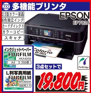 自分にとっては商売道具とも言えるプリンタだったが、社外品のインクを使ったせいなのか、インクが詰まって印字できなくなってしまった。つまり故障である。先月の中旬頃からほったらかしにしていたのだが、妻が「年賀状の印刷が間に合わなくなる」と煩い。 仕方がないのでネット通販でエプソンのEP702Aというのを買った。最近出された家電量販店の「○ジマ」のチラシに掲載された同型のモデルが、インクジェットペーパー250枚とL判の写真用紙400枚付きの値段で19,800円だったのと比べて、こちらは税込み送料込みで16,300円。しかも楽天ポイントを2200ポイント使ったので、実際に支払った金額は14,000円ほどである。もちろんECナビ経由で検索して購入したので、ECナビポイントも付いたはずである。 本日、自宅に届いたので開封してセットアップして使ってみたが、6色インクの具合がなかなか良く、年賀状の印刷には期待が持てそうである。スキャナーや、CDラベルのダイレクト印刷が出来るのが最低条件だったが、お金を出せば幾らでもあるのだが、今回はコストパフォーマンス的にいい買い物をした方だと思う。それにしても、事故って買い替える車のこととか、何かと物入りな師走である。■今回購入したショップのプリンタ【送料無料(沖縄・離島は除く)】EPSON EP-703A カラリオ・プリンタ【smtb-u】価格:21,630円(税込、送料込)【送料無料】※Colorio マルチフォトカラリオ EP-803A ( ブラックモデル/無線LAN/2.5型カラー液...価格:27,412円(税込、送料込)