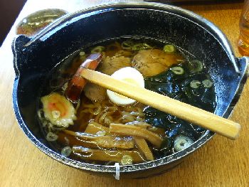 本日は、午前中は会社で仕事をやり、午後は自宅でシステム系の仕事を行うということに決めていたので、久々にお昼は外食にすることにした。自宅までの道すがら、矢板市にある店と言えば「米沢ラーメン 鈴木屋」が思い付いた。しかも今日は雨が降っていて、普段は店頭に行列が出来るほどだが、多分今日は混雑していないと予想した。 予想通り、店に入って席に着くことは出来たが、店内はそれでもお客がけっこう多い。 メニューを見て何にしようかと考えた末、「塩そば」を注文。ラーメンが来る間、ずっと厨房を見ていたが、ご主人が三枚肉を茹でたような角切り豚肉を網で焼き、上からは豪快にバーナーで焼いていた。これがラーメンに入るチャーシューの代わりと思われる。ずいぶん昔に食べたときは、もっと普通のチャーシューだったと思う。 そして出来上がりが下の写真の通りである。 黒いのはワカメと板海苔。煮卵はスライスされていて控え目。そして問題のチャーシュー(と言っていいのか?)である。塩味だからスープは澄んだ色だが、面白いことに大葉を刻んだものが入っていて、この香りが塩味スープを引き立てている。麺は米沢ラーメンのような細麺ではなく、中細麺で表面は柔らかい感触だが、腰がある麺である。全体としてバランスよくまとまっていて、なかなかの絶品である。但し本家本元の米沢ラーメンの味を期待して来店してはいけない。開店して9年になるらしいが、最早米沢ラーメンとは関係のない、独自の路線を辿っているのではないだろうか。これはこれで素晴らしい。■「米沢ラーメン 鈴木屋」の栃ナビ紹介サイト■「米沢ラーメン 鈴木屋」の場所