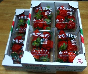 今朝、或る人からのお届け物が届いた。中身は栃木県の特産品、イチゴの「とちおとめ」である。しかも4パック入った箱が2つも。中を見てみるとかなり粒が大きい。まだ味見はしていないのだが、間違いなく上等な品である。「JAかみつが」とあるので、とちおとめの生産地の一つである鹿沼市のものである。 とりあえず自家消費するには有り余る量なので、1箱を自分の実家に持っていったら、一人ポツンと居間の炬燵に佇んでいた81歳になる実家の母に大変喜ばれた。いや寧ろ暇なところに、話し相手が出来たので、嬉しかったのかも知れない。父と若い頃手を引いて宇都宮の街中をデートした話が出てくるなど、大変饒舌に妻を相手に話をしていて満足げであった。 帰りしなに、焼芋、シュークリーム、生餃子2人前を貰ったのだが、どれも妻の好物ばかりである。まあ母の喜ぶ顔を見ただけでも良しとするか。■ギフト・プレゼントにも!〈JA鹿沼・JAかみつが〉とちおとめ■KM栽培つる付とちおとめ!「極うまいちご2パック」