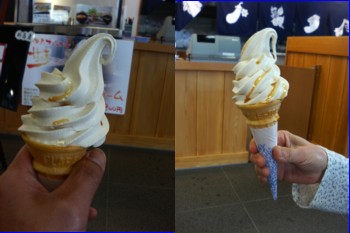 会社の仕事の関係で栃木県の特産品を調べていて、たまたま「醤油ソフトクリーム」というのを発見し、妻に話したら「休みの日に食べに行きたい」と言われたので、本日行ってみた。日光市(旧今市市)森友にある「旅の駅 日光ろばたづけ本舗森友店」でそのソフトクリームは食べることが出来る。「ろばた漬に醤油はつきものだからソフトクリームにも」と言う発想なのだろうか。ちなみに日光で漬物といえば「たまり漬」だが、「ろばた漬」も広義のたまり漬と言える。 お店の入口を入って中央がろばた漬などの土産物の売店で、右隣が食事処で、ここで醤油ソフトクリームを注文できる。ランチタイムは11:00~14:00(ランチタイム以外はカフェ営業のみ)であるが、ソフトクリームは営業中なら常時販売している。 妻と2人分注文したら、店員が先ず妻の分を持ってきた後、自分の分を片手に、もう一方の手に醤油差しを持ってきて、自分達に持たせたソフトクリームに醤油をこぼれ落ちないように何滴かたらした。これで醤油ソフトクリームの完成である。もちろんソフトクリームに醤油は練りこんであるのだが、店員曰く「見た目をそれらしくするために」醤油を掛けるのだそうである。 味は、全然ミスマッチということはない。なかなか美味しいが味の例えようがない。塩キャラメルとも違うし、みたらし団子をソフトクリームにしたという風でもない。日光方面へお出かけの際は一度お試しあれ。■「旅の駅 日光ろばたづけ森友店」の場所■「旅の駅 日光ろばたづけ森友店」の栃ナビ紹介ページ