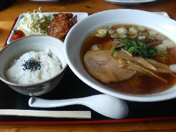 今日は、那須烏山市へ会社の用事で行ったついでに、同市で有名な龍門の滝の近くにある「らぁめん花」でランチを食べてきた。栃ナビの「ラーメン特集」に載っているお店で、以前から食べてみたいと思っていた店なので、ちょっと期待して訪ねてみた次第である。お店の作りは若干年季が入っていて、店内はやや狭いが奥に座敷があって、一応全部で25席はあるようだ。 自分はラーメンに唐揚げ、御飯、お新香がつく唐揚げセットを、妻は例によって手作り餃子を二人前を注文。程なくして運ばれてきたのが下の写真である。 ラーメンは、この店では「らぁめん」と表記しているのだが、あっさりサッパリの細麺で、いわゆる昔懐かし「支那そば」という感じだろうか。スープは余り油が浮いておらず、若干塩辛目だが、なかなかの美味しさである。唐揚げも揚げたてで、カラッと揚げられていてなかなか美味しかった。あえて苦言を言わせて貰えば、添物のキャベツの千切りの切り方は自分の方が上手だと思う。餃子は大き目の包みで、野菜がいっぱい詰まった、いわゆる野菜餃子である。妻曰く、期待した以上に美味しかったようである。 ちなみに妻は、夕食にもスーパー惣菜コーナーの餃子2人前を一人で抱えて食べていた。どこまでも餃子道を貫く妻であった。■「らぁめん花」の栃ナビ紹介ページ■「らぁめん花」の場所