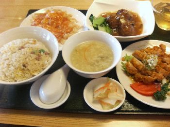 日曜日に黒磯文化会館で映画を見た後、旧西那須野町あたりでランチを食べようと思い、車を走らせていた。街中のレストランの看板を物色していると「本格中国料理を安く美味しく 380円~」という赤い看板の目新しい建物が目についたので、思わずブレーキをかけ、立ち寄ってみることにした。「チャイナレストラン 新洪記」という中華料理の店である。 店内は、6人掛けの広いテーブルのボックス席や畳敷きの大広間があり、大宴会にも使えそうである。自分達はボックス席に通されたが、若干明かりを落とし気味で落ち着いた雰囲気である。注文の方だが、自分は380円程度の料理が三種と炒飯、スープ、デザートがついて千円のお得なランチセットを、妻は自家製焼売・フカヒレ蒸し餃子・エビ蒸し餃子・肉まん・小龍包・桃まん・ココナッツ団子の中から好きな点心を五種類選べる飲茶五種[500円]、七種の色で七禧の味の七禧餃子[400円]とデザートに杏仁アイスを注文。程なくして運ばれてきたのが下の写真の料理である。 ランチセットの料理の方は、イカと小海老をチリソースで絡めたもの、肉団子、鶏肉揚げの特製ソースかけに炒飯、スープ、ジャスミンティのゼリーのデザートが付いて、普通なら二千円ぐらいするところを千円で提供しているとのことである。多分日によって料理は変わるのかも知れない。イカと小海老のピリ辛炒めは、けっこう辛さが癖になる美味しさだし、肉団子の甘辛いタレも申し分ない。鶏肉揚げもなかなか美味しかった。あえて言えば炒飯の塩加減が薄く、イマイチだったかもしれない。 点心五点盛りの方は、さすがにフカヒレ餃子が一番美味しかったようである。またココナツ団子はデザートの甘さで美味しかったらしい。七禧餃子は彩りが美しく、魚のすり身を餃子にしたものがあったのに妻は目新しさを感じていたようであった。 初めて来た店なので、イマイチこの店のお得な食べ方の攻略法が分らなかったのだが、次回来店時には少し考えて美味しいものをお安く食べてみたいと思う。それにしても餃子・点心系にしか目がいかない妻はつくづく芸がない。■「チャイナレストラン 新洪記」の場所■「チャイナレストラン 新洪記」のグルメGYAO紹介ページ