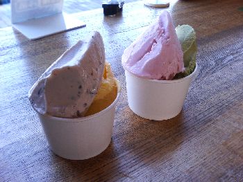 結局この三連休はほとんどどこへも行かなかった。ちょっと近所で外食したぐらい。それと外食のついでに「道の駅ばとう」まで足を伸ばして、農産物直売所で長葱とホウレンソウ、それに「はんじゅくち~ず」タルトのお菓子を買って、ついでにここのジェラートを食べたことぐらい。 ジェラートはこの季節限定で、「さくら」と「よもぎ大納言」が出ていた。妻はそれを注文した。上の写真では右側の方である。自分はチョコチップとマンゴーミルク。写真の左側にある方である。どれも美味しいが、よもぎ大納言は色といい、程よい甘さといい、なかなかの絶品である。ジェラートのお値段は、シングルが250円、ダブルで300円である。ダブルで注文しないのは損である。 ところでこの「はんじゅくち~ず」タルトは、以前ブログで紹介したが、甘過ぎずチーズ臭くなり過ぎず口あたりが滑らかで美味しい。お値段は130円。那珂川町の「森川屋菓子店」の商品である。■森川屋菓子店の場所
