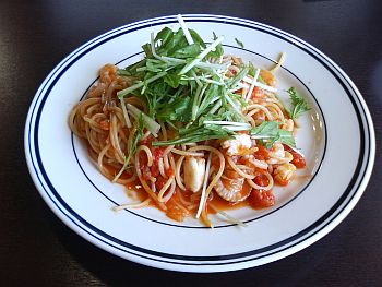 この前の日曜日のお昼に、久し振りに「レストランしんめい」でランチを食べてきた。自分は相変わらず豚焼肉定食を、妻はトマトソースパスタとアイスクリームを注文。普段妻は、しんめいハンバーグセットを注文するのだが、メニューをパラパラとめくっていたら、新しいパスタのメニューも2種類(和風パスタとトマトソースパスタ)だが、増えていたので注文したのである。意外だがアイスクリームも注文するのは初めてである。程なくして運ばれてきたのが、下の写真の通りである。 トマトソースパスタだが、ホタテ、イカ、小海老が入っているので、いわゆるペスカトーレ(漁師風パスタ)というやつである。味は調っていてまあまあの美味しさだということである。 豚焼肉定食だが、何度もブログに書いてきたので今更書くことは無いが、相変わらず安くてお腹一杯になる庶民派のメニューである。 二人とも食べ終わった後、注文したデザートを運んでくれるようお願いしたのだが、けっこう時間がかかってようやく運ばれてきたのが下の写真のアイスクリームである。自分達は、単にバニラアイスが器に載って運ばれてくると思っていたのだが、運ばれてきたのはすっかりデコレーションされたアイスクリームであった。これなら300円は安いかもしれない。