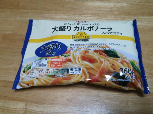 最近の日曜日のランチはイオンで購入したトップバリューの冷凍パスタッスね。税込価格が148円で、360gとけっこうなボリューム感があって、食べごたえ十分で腹持ちがイイッス。日清のカップヌードル食べるよりは安くて美味しいんじゃねぇかと思います。今日は、「ほうれん草、ベーコン入り大盛り カルボナーラスパゲッティ」って奴でした。500Wの電子レンジで7分30秒温めるのは少々イラッと来ますがご愛嬌。乾麺のパスタを茹でてレトルトのソースを掛けるよりは全然手間要らずッス。 ちなみに姉妹品で「大盛りミートソース」と「大盛りナポリタン」あって、うちは週替りで食べてますね。