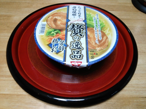 この間の日曜日の朝、そぼ降る雨の中イオン・ビッグエクストラへ一週間の買い出しに行った折に購入した「贅の逸品 芳醇鶏しお」ってぇのがワゴン売りされていて値段が100円しなかったんでつい手にとって買い物かごに入れてしまいました。 フタを開けて中身を確認するとなんとチャーシューが2枚入ってたんスねぇ。普通に買ったら高そうだなぁとは思ったんスけど、すかさずその日のランチに食べたら、なかなか上品でさっぱりの鶏しおスープ。麺もさすがに日清なのでぬかりなく生麺に近い食感です。あとで調べてみたんスけど多分希望小売価格は298円ッスね。3分の1の値段で買ったわけかぁ。1つと言わず、もう少しまとめ買いするんだったと後悔しました。↓人の動画っすけどこんな感じ。 さぁて、コーディングの仕事の続きやるかぁ。