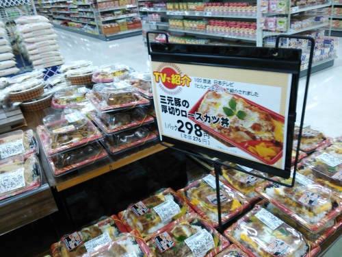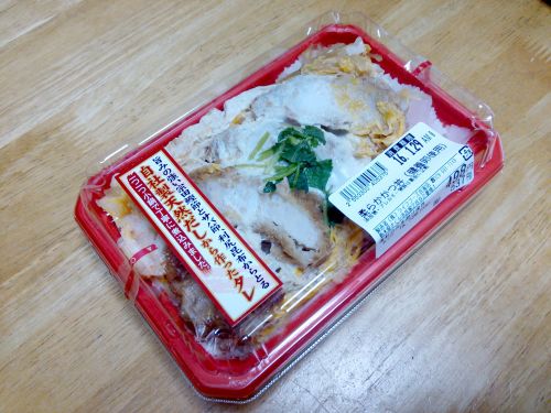 今日は在宅勤務で、お昼に会社用のレギュラーコーヒの豆とお弁当を買いにベイシア・スーパーセンターさくら店へ。お弁当コーナーを見たら「厚切り三元豚のロースカツ丼」がいっぱい並んでいて、「どうぞ食べて下さい」と言わんばかり。ふとポップをみると日テレの1月20日放送の「ヒルナンデス」って番組で紹介されたとある! 三元豚のロースカツ弁当にもちょっと惹かれたんですが…。 やっぱり298円という破格のお値段とカツ丼という響きに負けて、カツ丼にしました。やっぱりカツ丼好きだなぁ。ちなみに汁物はサッポロ一番のわかめそばってやつです。 ところで「ベイシア カツ丼」というキーワードで検索すると、なんと検索順位第2位で自分のブログがヒットするんスよね。ひょっとして「ヒルナンデス」で紹介されたのは、自分のお陰も少しはあるかもと思うわけですよ。
