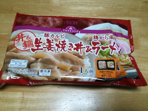 例によって一週間の買い出しにイオン・ビッグエクストラさくら店に行った折、また性懲りもなく変な冷凍食品を買ってきてしまいました。昨年12月中旬にブログで紹介した奴です。「豚カルビ 生姜焼き丼 & 鶏ガラ風味 ラーメン」です。 外袋を開けるとフィルムに包まれた容器に生姜焼き丼とラーメンが凍った状態で出てきます。それとレンジで温めた後にラーメンに入れるスープが入ってますがコレはレンジで温められないので流水とかお湯で溶かしておきます。 500Wの電子レンジで8分20秒温めてフィルムを撮った状態が上の写真。肝心のお味の方ですが、さすがにお店で食べるような丼物には味は落ちるものの、なかなか健闘してるんではないかと。ラーメンの方は、今どきの美味しいカップ麺には負けるかなぁ。429円で麺と丼物が食べられるというのは安いかもですね。但しサラリーマンが会社へ持ち込んで給湯室の電子レンジを8分20秒も占領すると、他の社員からブーイングが来るでしょうねぇ。シチュエーション的には、たまの日曜日に外出する奥さんが旦那さんへ「あなたお昼は冷凍庫のコレでも食べてね」と言って置いていくような食品って感じっすかぁ?