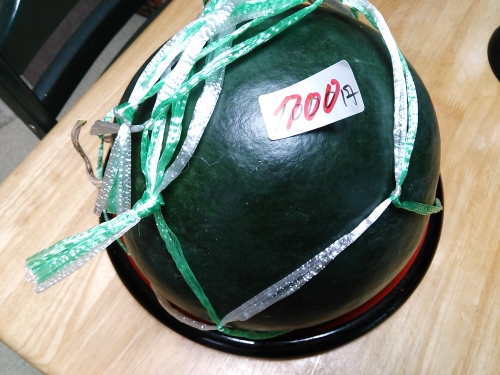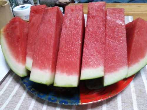 嫁に「頭が世界の小澤(征爾)」等と揶揄されて、お盆を迎えるのに如何なぁと思って理容店へ。その道すがら、道端にパラソルと台を置いただけの無人の野菜販売があって、そこにカボチャとスイカが2~3個ずつ置いてあった。そのスイカの値札に最初1,000円と書かれた上から赤字で700円と書かれていたので、これは安いと思って缶の銭箱に700円を入れて立ち去ろうとした。 するとここを管理している農家の人がやって来て「実は瑞々しいんだけど、種無しで甘みが薄いんで安くしたんだよねぇ」と声をかけてきた。 「あぁ、そうなんですかぁ」と言いつつも、心の中で「なんだそういうことかよぉ」と思いながらも、なんだかひくに引けず持ち帰ってきた。甘かったら嫁の実家か、ウチの実家の盆参りの手土産(御佛前とは別)に持って行こうとも思ったが止めたぁ。そもそも義兄は山形なので尾花沢の美味いスイカを持ってきているに違いない。 さてさて兎にも角にも家に持ち帰って冷蔵庫の野菜室に入れようとしたら、スイカがおおきくて上部トレイに当たって入らないんで、とりあえずトレイは外して入れて置いた。 嫁と二人でスイカを食べきるのに何日掛かるか思案した。
