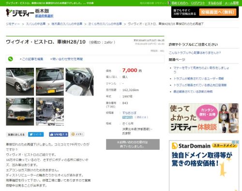 マツダ・カペラワゴンFX→マツダランティス→ダイハツ・ミラ・ターボTR-XX→スバル・ヴィヴィオ・ビストロ・スポーツと乗り継いできたんスけど、最近、在宅勤務になって通勤に車を使わなくなったんで、今年の10月に車検切れになったのを契機にジモティに掲載してヴィヴィオ・ビストロちゃんを売りに出しましたところ、7,000円で買い手がつき、売ることにしました。 今回、贔屓にしてる修理工場に車の管理をお願いして、買いたい人が修理工場の営業時間ならいつでも現車確認できるようにしてもらったり、名義変更や廃車の手続き等を修理工場にお任せしたり出来たんで、セキュリティ的にもけっこう安全っすねぇ。 このヴィヴィオ・ビストロ、ストラット四輪独立懸架で足回りは軽自動車のわりにけっこうよくて、テールランプは丸目4灯で日産スカイラインR33のを流用してるし、エンジンもハイテンションコードを替えたら吹け上りがいいんで気に入ってたんスけど、お別れっス。今は普段の足としてスズキアルト(LA-HA23S)をYahooオークションでコミコミ7万円(車検H30/5月)で落札して乗ってます。